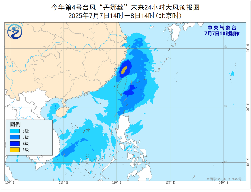 大风预报:7月7日14时至8日14时,南海东北部和西南部的部分海域、台湾海峡、台湾以东洋面、巴士海峡、东海南部及钓鱼岛附近海域、广东东部沿海、福建沿海、浙江沿海、上海沿海、台湾岛沿海将有6~8级风,阵风9~10级,其中“丹娜丝”中心经过的附近海域风力可达9级、阵风10~11级。