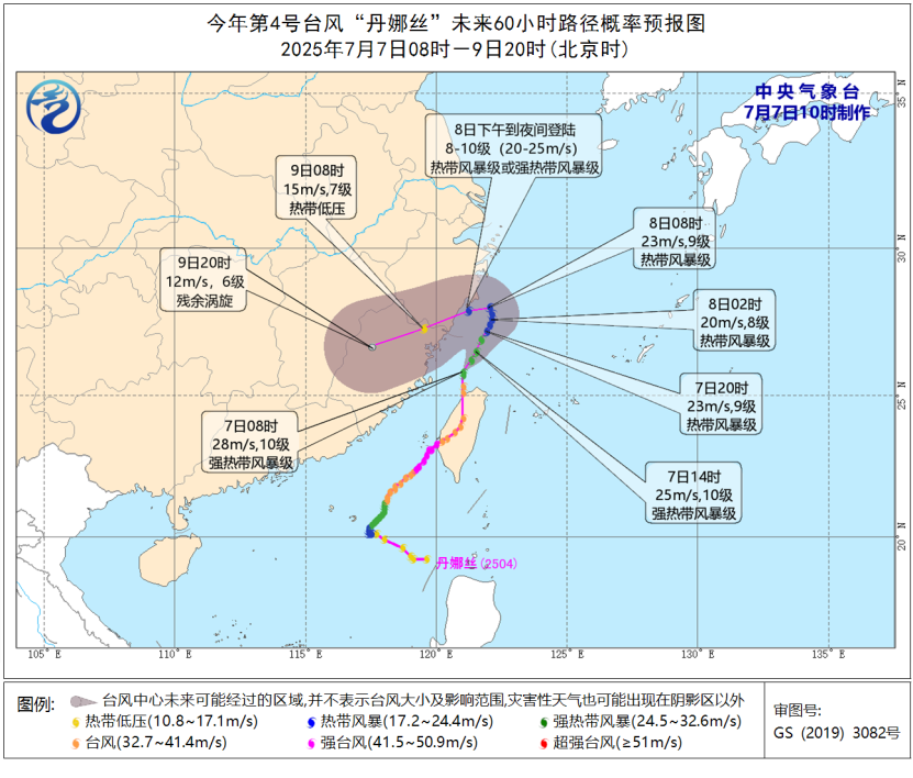 今年第4号台风“丹娜丝”已于今天(7日)早晨7点减弱为强热带风暴级,其中心上午9点钟位于浙江温岭偏南方约290公里的东海西南部海面上,就是北纬25.8度、东经121.0度,中心附近最大风力有10级(28米/秒),中心最低气压为982百帕,七级风圈半径150~180公里,十级风圈半径20~30公里。