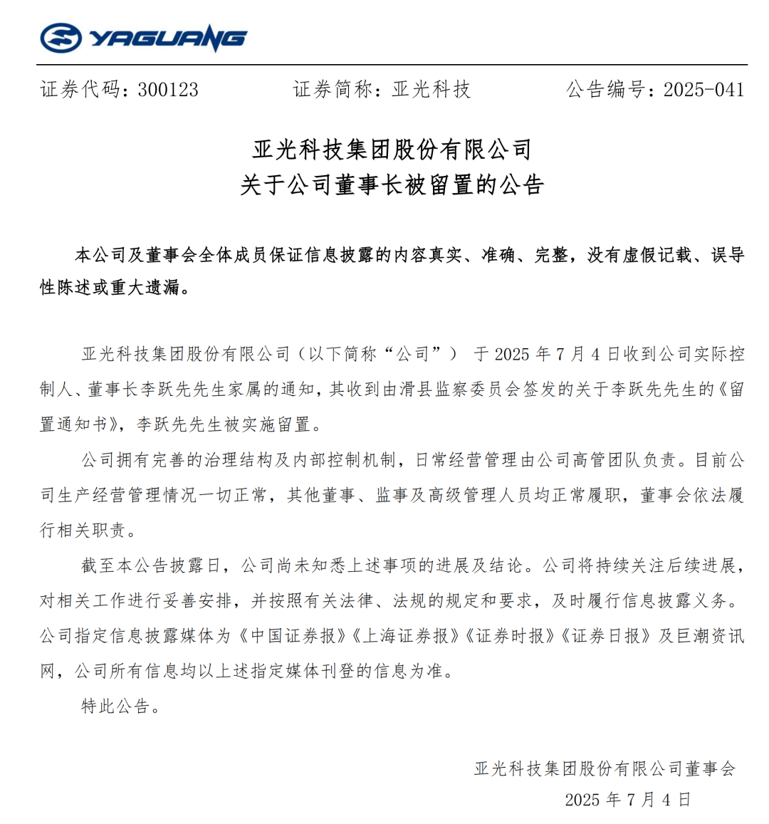 就在7月4日晚间,亚光科技突发公告称,李跃先被实施留置。截至公告披露日,公司尚未知悉上述事项的进展及结论。