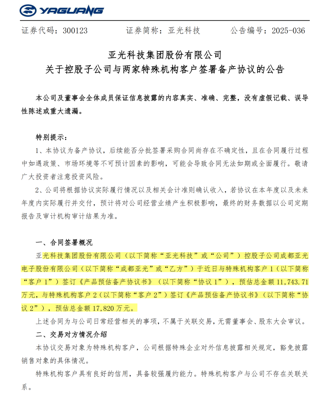 5月上旬,亚光科技发布公告称,公司控股子公司成都亚光收到与特殊机构客户签订的《产品预估备产协议书》,预估总额约1亿元,占公司最近一个会计年度经审计的营业收入的10.56%。