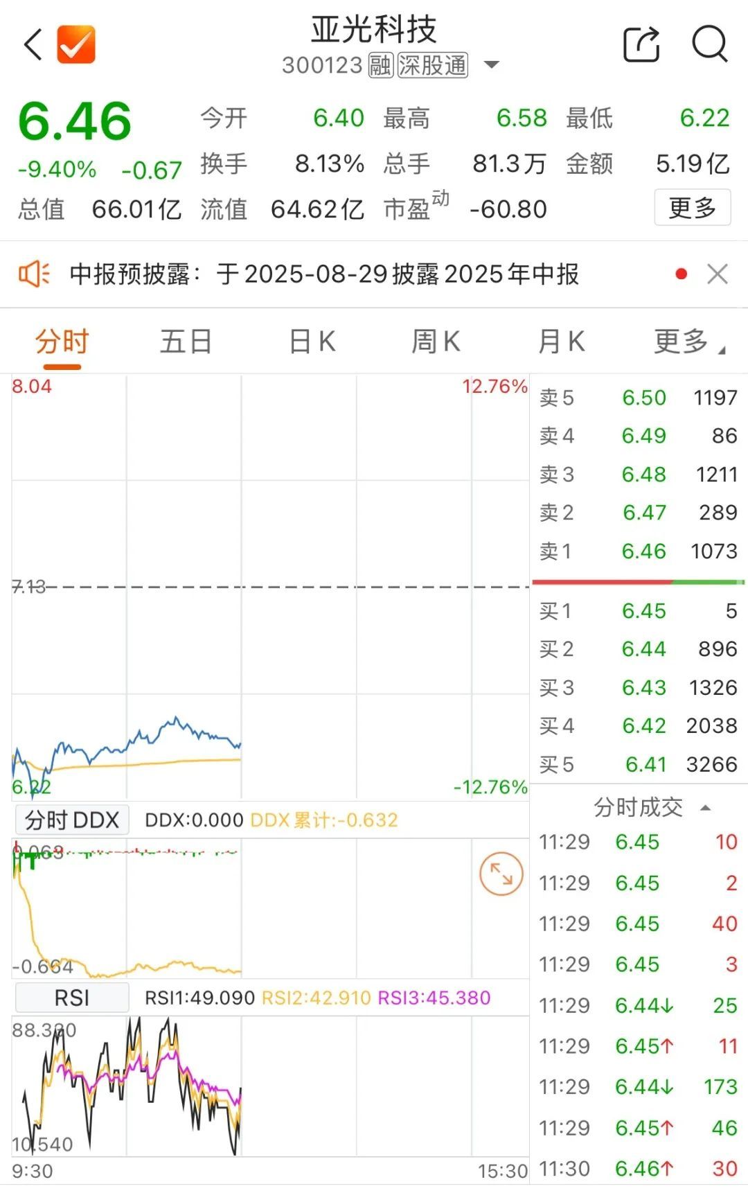 7月7日早盘,亚光科技股价大幅低开,盘中一度跌超12%,截至午间收盘跌9.4%,报6.46元/股。