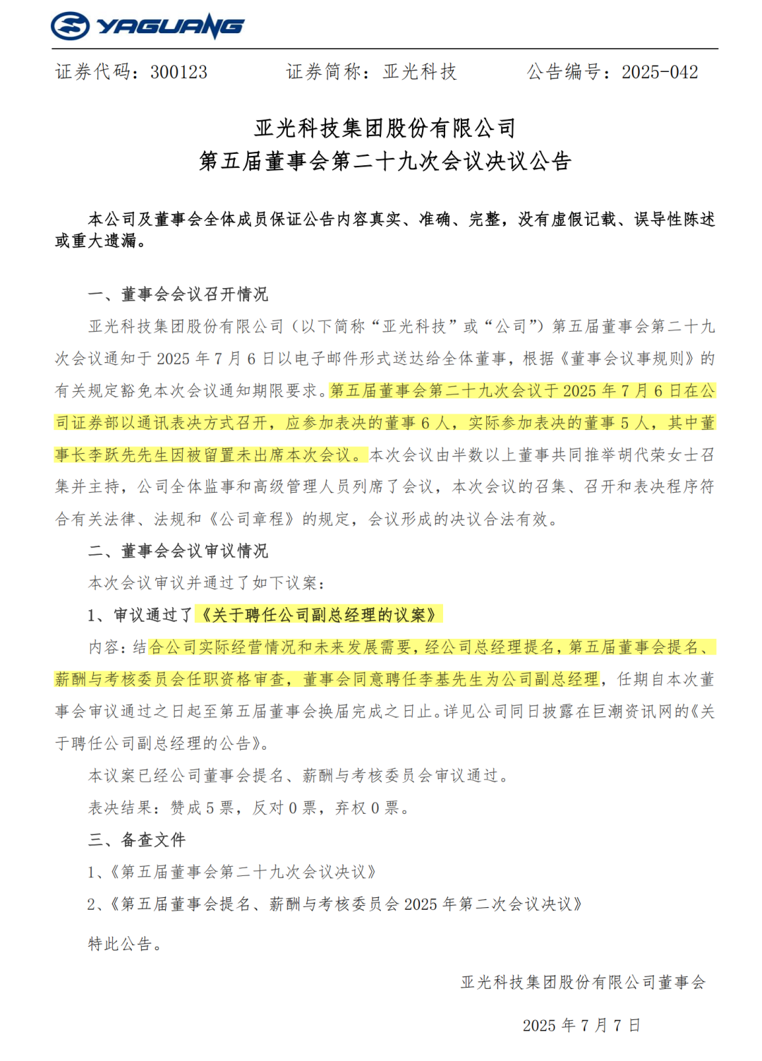 据公告,亚光科技本次会议由半数以上董事共同推举总经理胡代荣召集并主持,公司全体监事和高级管理人员列席了会议。结合公司实际经营情况和未来发展需要,经公司总经理提名,第五届董事会提名、薪酬与考核委员会任职资格审查,董事会同意聘任李基为公司副总经理,任期自本次董事会审议通过之日起至第五届董事会换届完成之日止。
